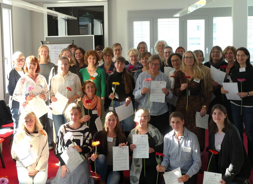 Frauen, die lachen, stolz ihre Zertifikate und Blumen in den Händen halten zeigt Freude, Verbundenheit und Dankbarkeit.